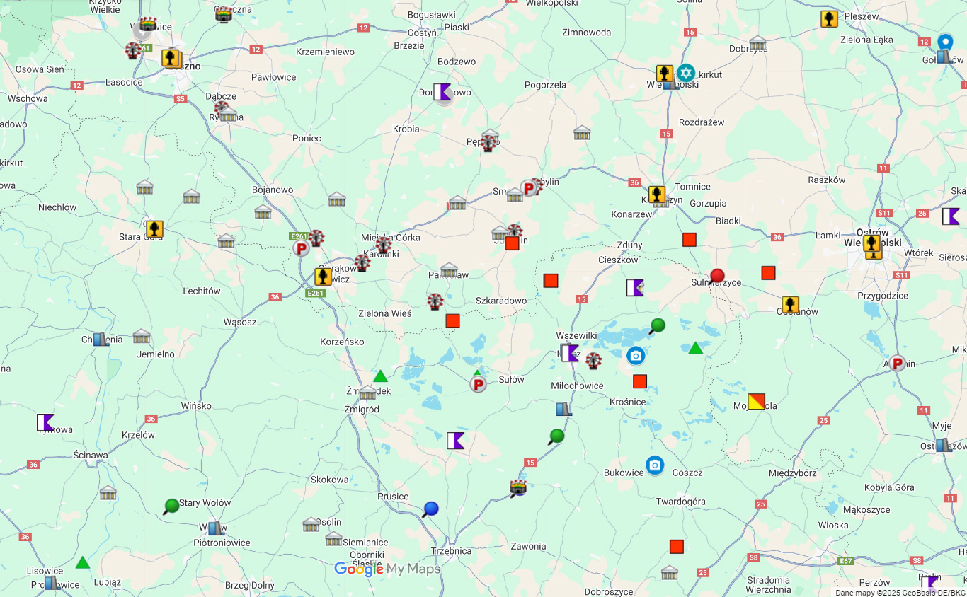 Ikonki pałacu to pałace. Też w różnym stanie. Najczęściej, niestety, mocno zaniedbanym. Przekoszony kwadrat w kolorze fioletowo-białym to kościoły drewniane i szachulcowe. Chyba, że wiadomo, że są super, extra, hi-fi to wtedy niebieską lupką. Zielone lupki to parki krajobrazowe, a zielone trójkąciki to rezerwaty przyrody. Te, do których warto, albo bardzo warto. Czarne kolumny na żółtym tle to wieże ciśnień.